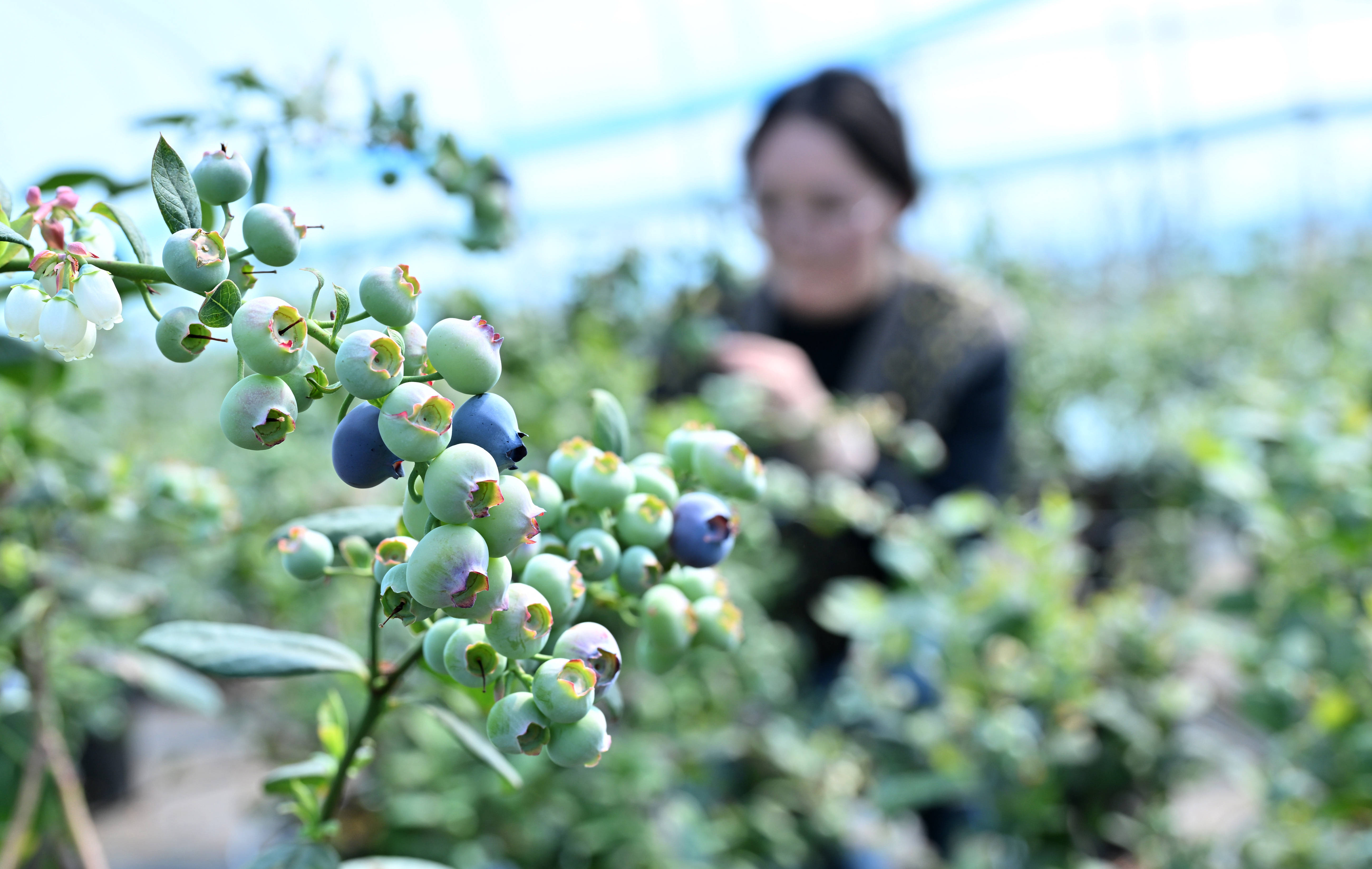 ↑2026年3月25日,游客在山东省青岛市城阳区上马街道一处蓝莓园采摘蓝莓。CICPHOTO/王海滨 摄