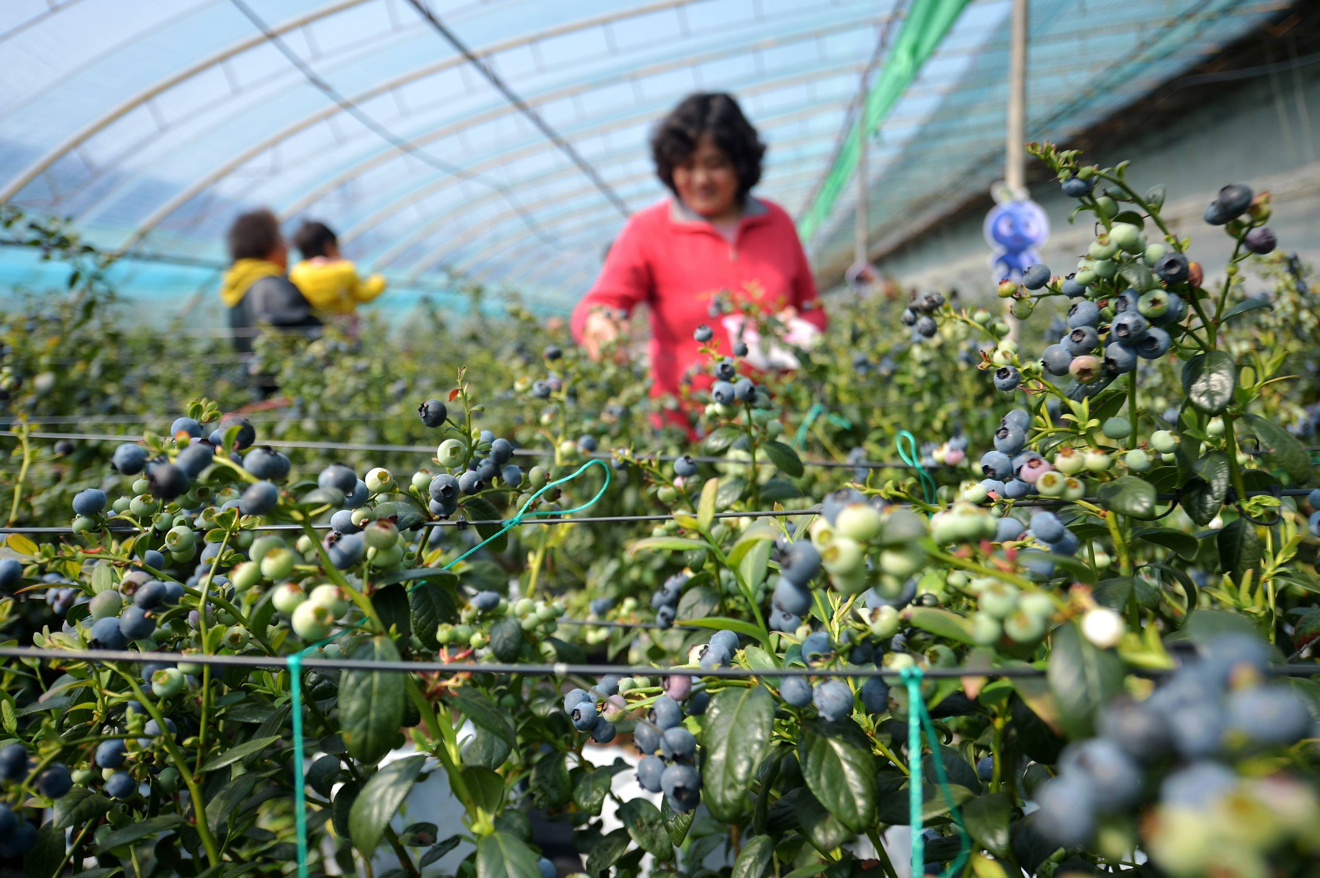 ↑2026年3月25日,游客在河南省商丘市夏邑县济阳镇济北村乡村振兴产业示范基地采摘蓝莓。CICPHOTO/苗育才 摄